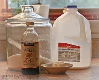 I have several quart sized jars that I use for the process. You will fill your jar about 2/3 with milk and heat it in the microwave for a minute or so, just until the chill is off but it is not hot. We like vanilla yogurt, not being purists, so I add 1/3 cup of sugar and 1 teaspoon of vanilla to the milk . Next you will stir in two tablespoons of yogurt into the mix and stir with a whisk until it is well mixed. Then I top off the jar with either half and half or more milk and put the lid on.